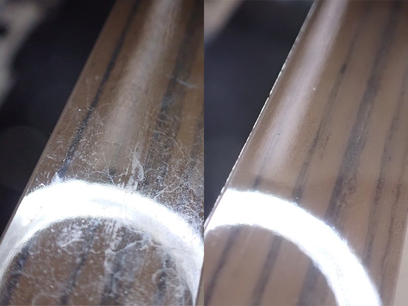 同じクロスだと洗剤が残って仕上がりが濁るので、水だけを含ませたクロスを固く絞り、しっかり洗剤膜を除去します。