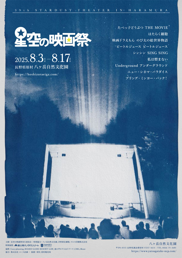 2025年8月3日(日)から8月17日(日)まで、長野県諏訪郡原村にある「八ヶ岳自然文化園」で『第39回 星空の映画祭』が開催。八ヶ岳の麓、八ヶ岳中央高原の野外に夏の時期だけ特別にオープンする、星空の下の映画館です。開催期間中は、「たべっ子どうぶつ THE MOVIE」や「はたらく細胞」、「映画ドラえもん のび太の絵世界物語」、「ニュー・シネマ・パラダイス」など多彩な作品を日替わりで上映。