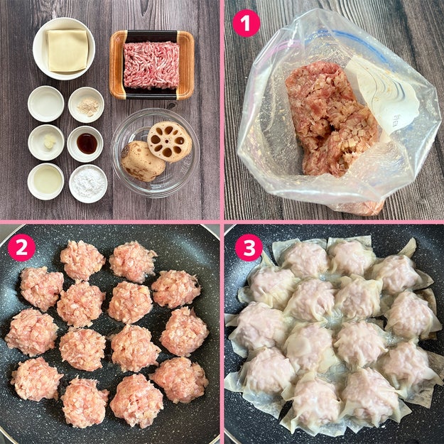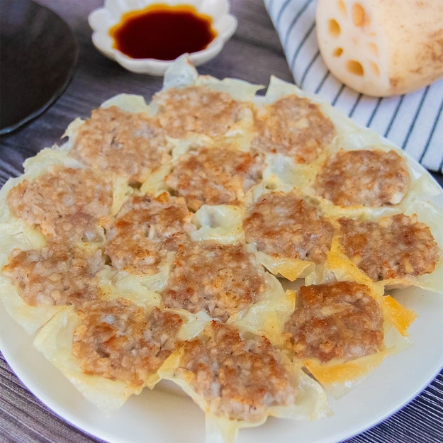 ③ 水で湿らせたシュウマイの皮を一枚ずつかぶせ、中火にかけて3分焼く。弱火にし、ふたをして5分ほど加熱する。ひっくり返して器に盛ったら、完成!