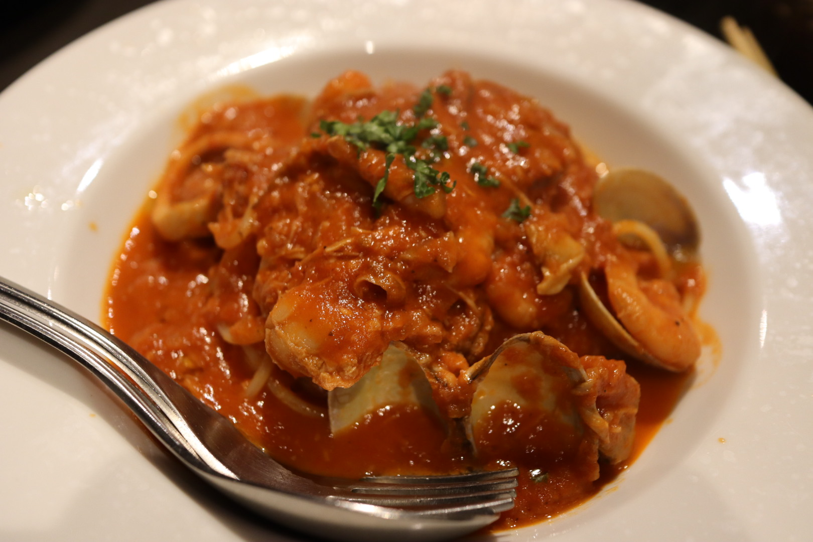 濃厚なトマトソースがパスタによく絡み、海老と白身魚の旨みがたっぷり。ニンニクや唐辛子の量も好みに合わせて調整してもらえるのが嬉しいポイントです◎