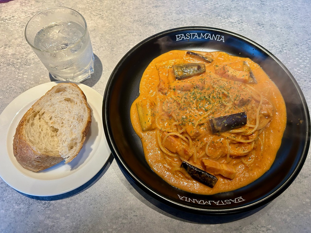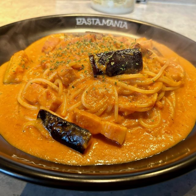 濃厚なトマトクリームソースに、肉厚のベーコンとシャキシャキのナスがたっぷり。