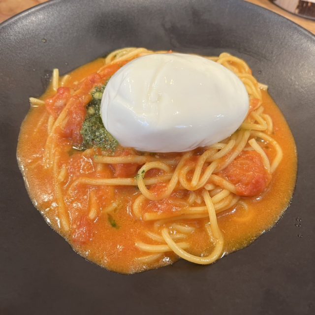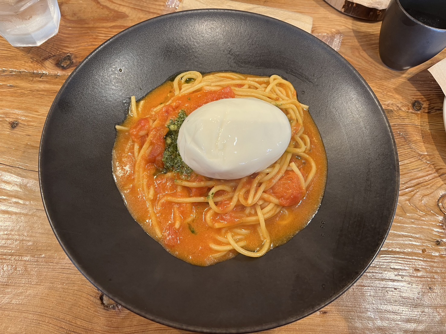 つやつやとしたまんまるのチーズを切ると、濃厚なチーズがぎゅっと詰まっています。フレッシュなトマトソースともちもちの生麵パスタとの相性が抜群で、チーズ好きにはたまらない一品です◎