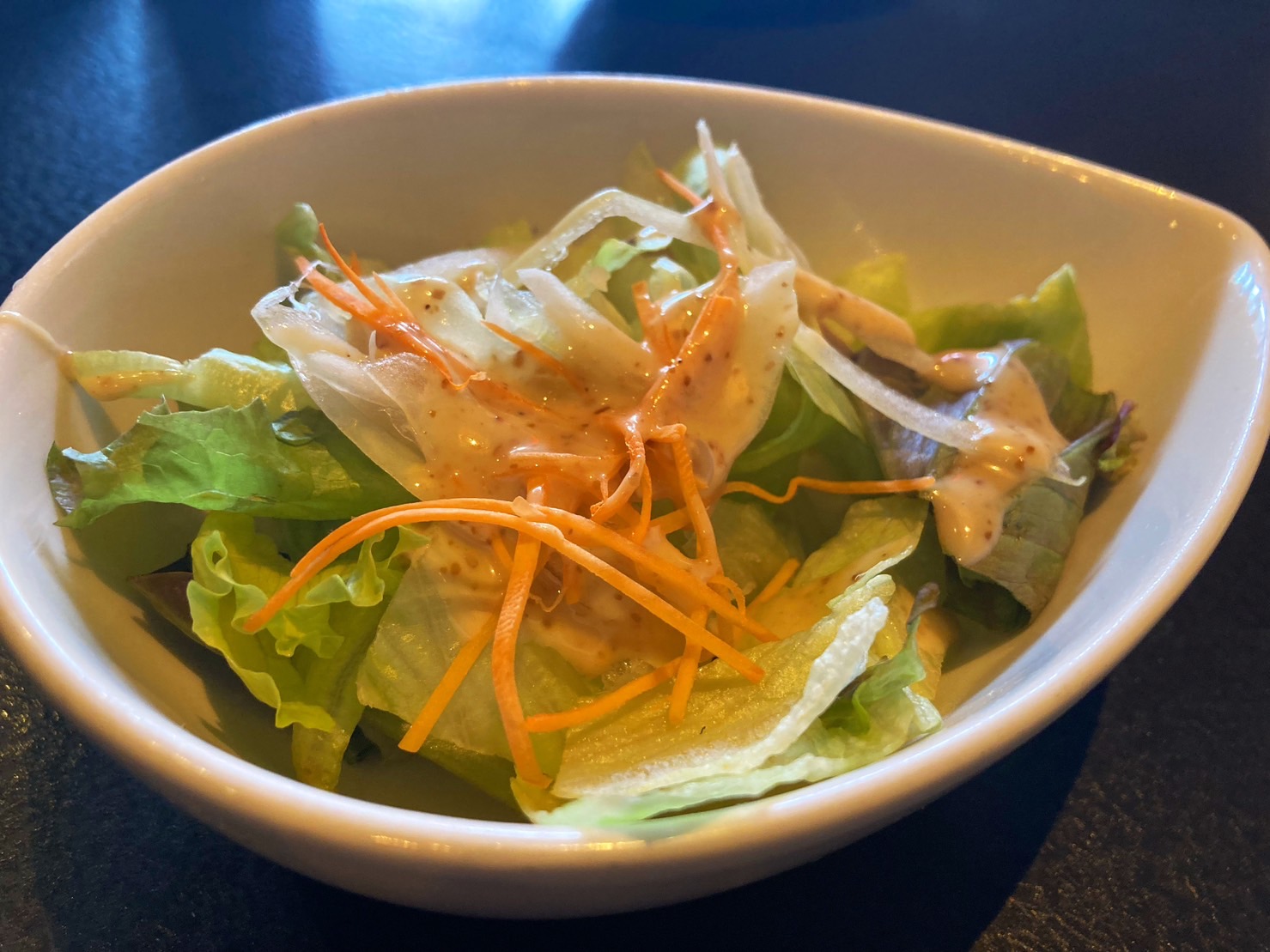 土曜日のお昼には10人ほどが並ぶ人気店。無農薬自家栽培の野菜を使ったミニサラダがサービスでついてくるのも嬉しいポイント♪