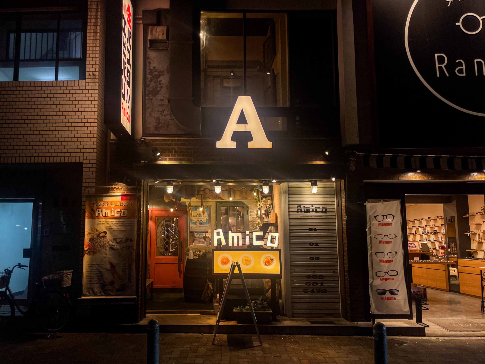 矢場町駅から徒歩5分の場所にある「AMICO(アミーコ)」さん。巨大な「A」の文字が光る看板が目印のイタリアンバルです。