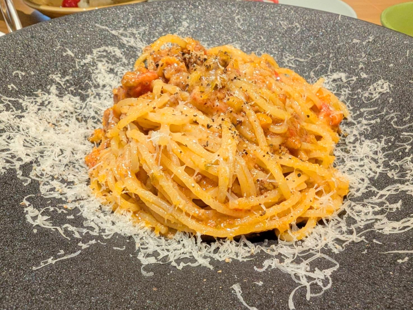 じっくり煮込んだ自家製のボロネーゼソースは、香味野菜と赤ワインで深みを引き出した濃厚な味わい。