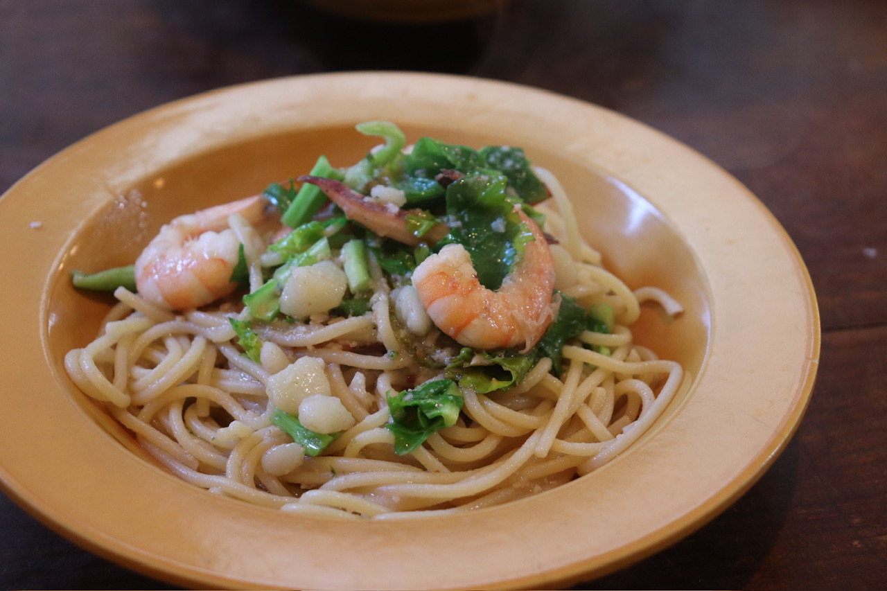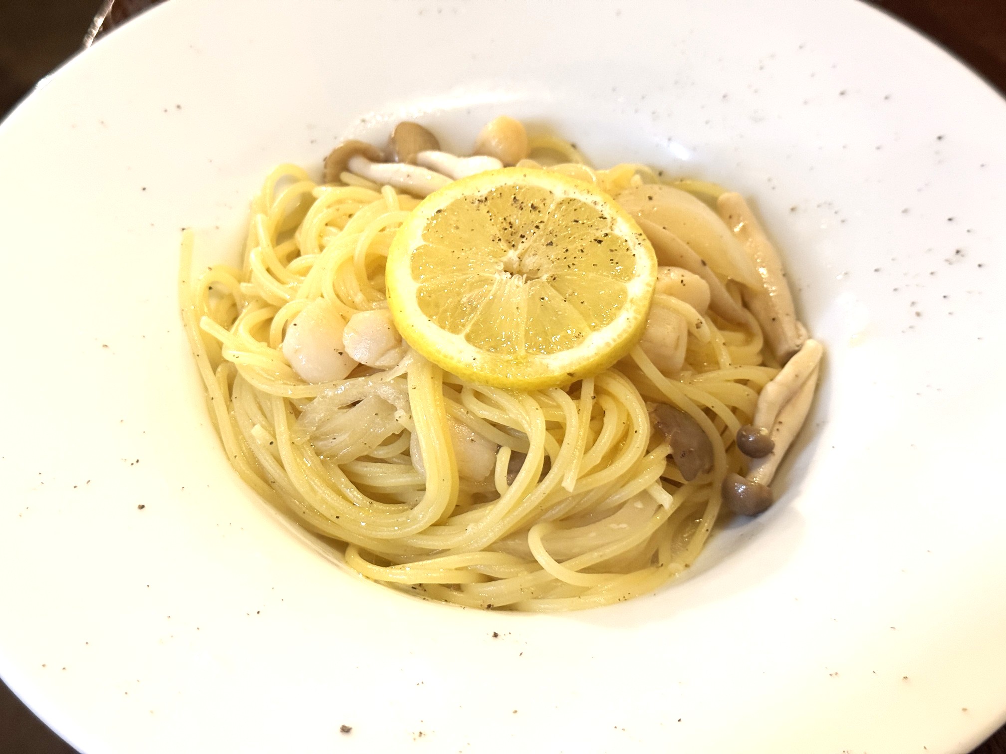 人気の貝柱のレモンパスタは、ホタテ稚貝の貝柱ときのこを使ったあっさりめの味わい。