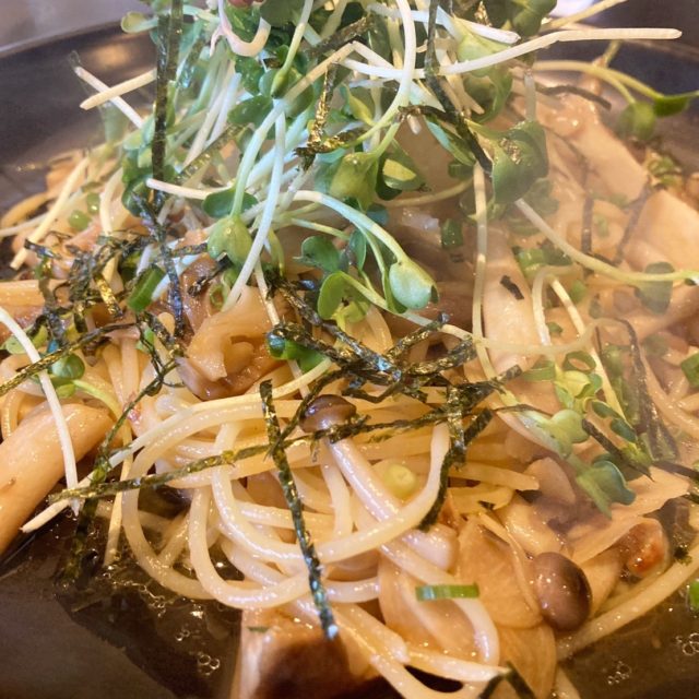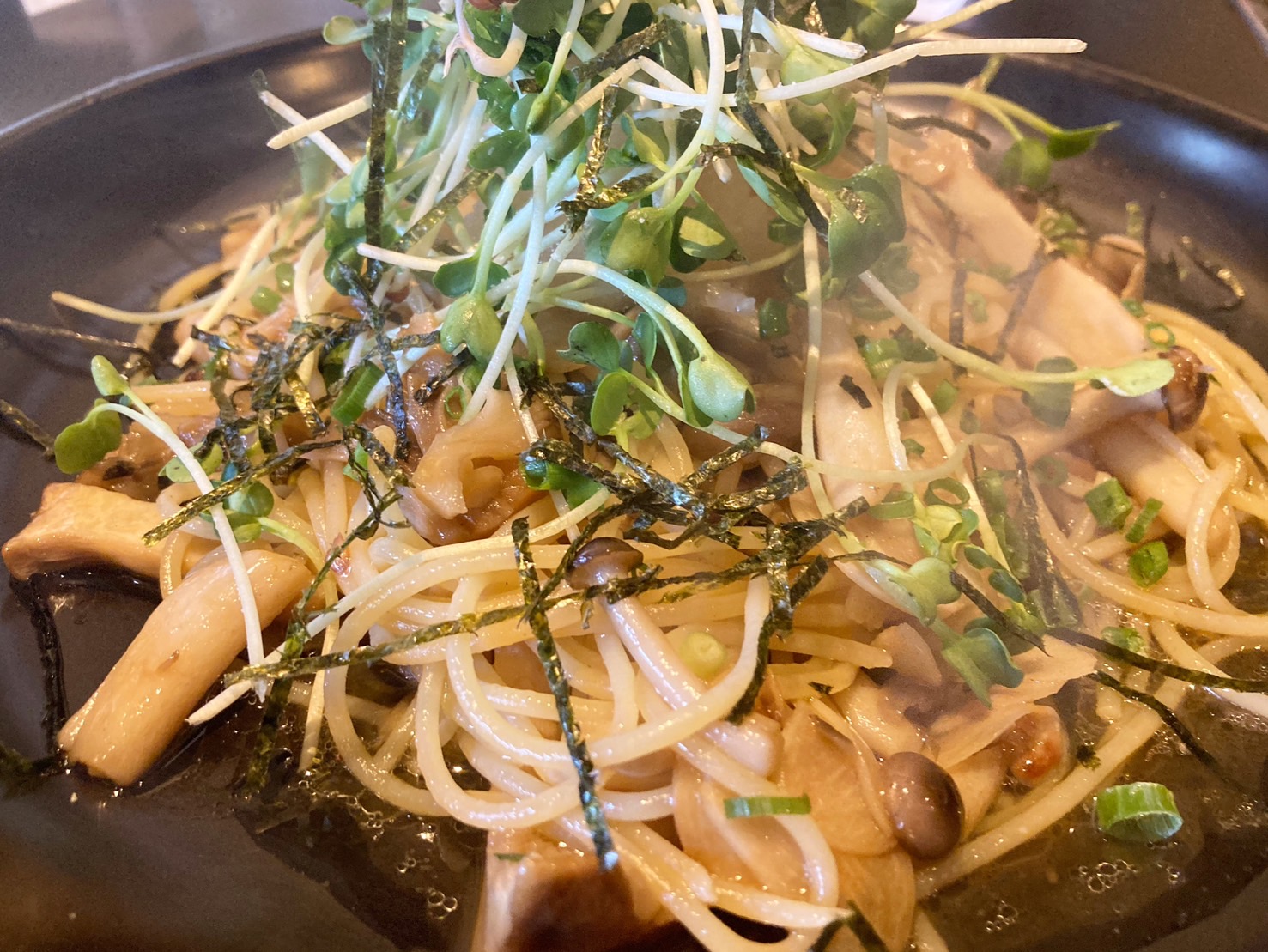 きのこたっぷりでボリューム満点、ニンニクがしっかり効いたガッツリ味です。たっぷりの大根おろしのおかげで後味はすっきりしていて食べやすく、海苔やかいわれなどの具材も調和したハイレベルな一品です◎