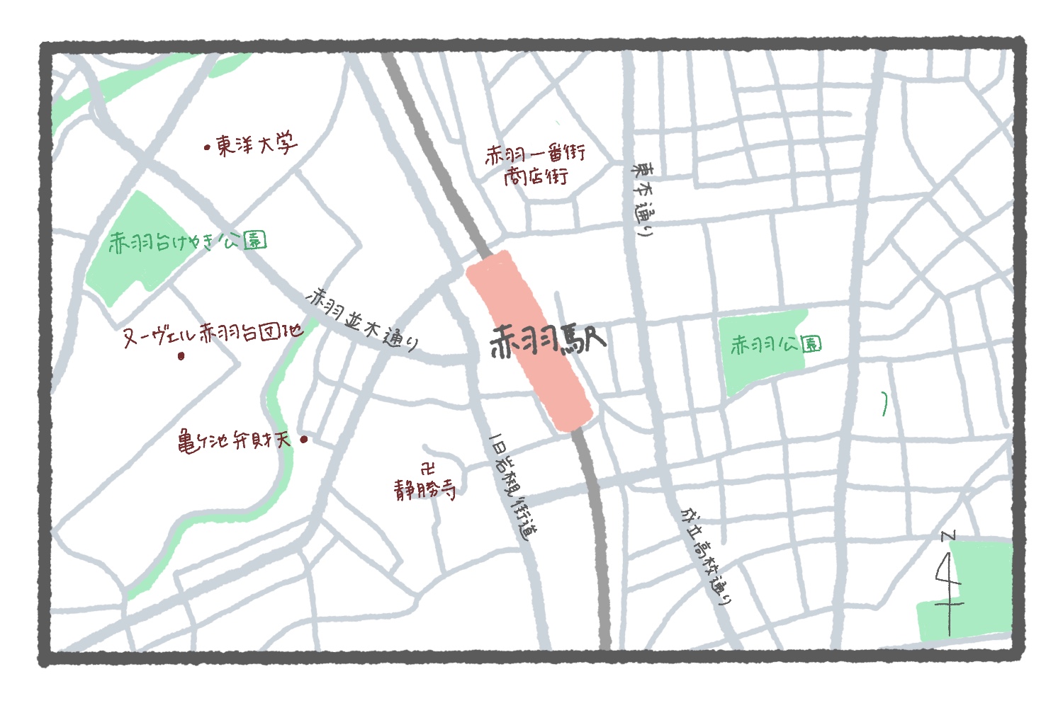 駅西側の広い敷地は赤羽台。URの大きな団地や東洋大学情報連携学部のキャンパスがあり、かつては陸軍の施設が置かれていた場所だ。その事実を知っていれば、察しがついたかもしれない。
