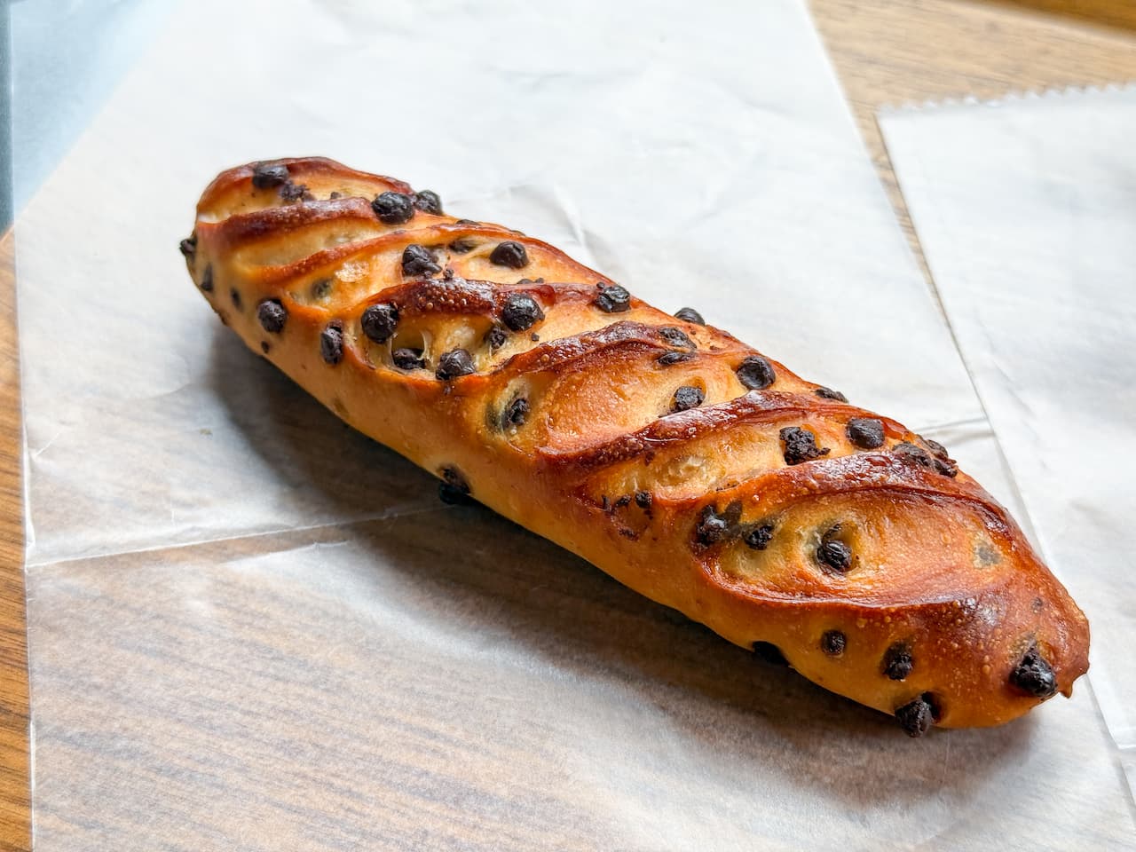 しっかりと噛みごたえのある「ヴィエノワ ショコラ」。上にも下にも、そして中にもチョコチップがぎっしり詰まっていて、ひと口ごとに幸せが広がります。甘さ控えめで、大人も子どもも食べやすいバランスです。