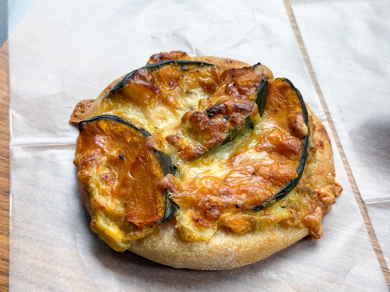 ボリューム満点の「かぼちゃとひき肉のグラタンタルトフランベ」は、分厚くて甘いかぼちゃが豪快に乗った、インパクトのある一品。玉ねぎ入りのクリーミーなソースがよく絡み、ひとつでも十分満足できるグラタン仕立てのハード系パンです。