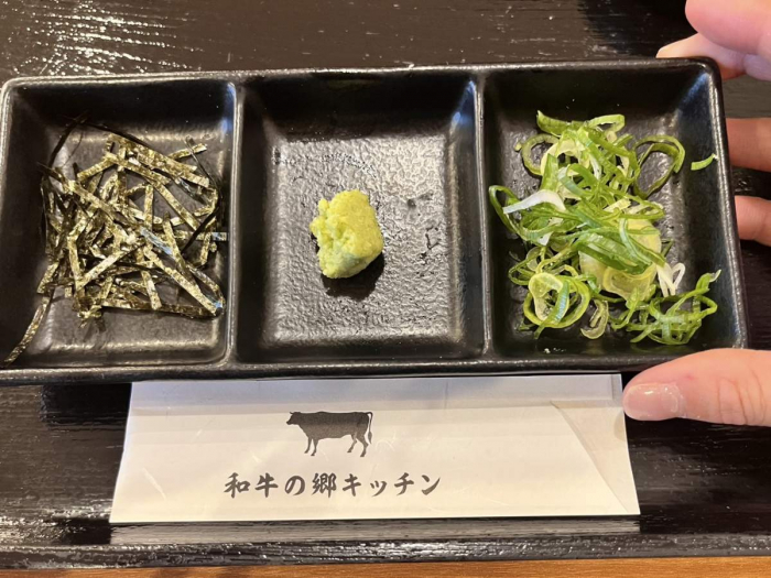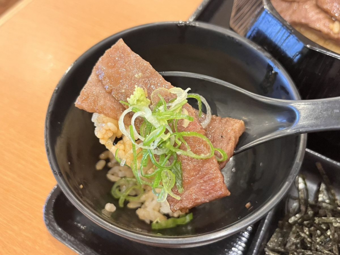 わさびのツンとした辛みが黒毛和牛の甘みを引き立て、ネギのシャキッとした食感がアクセントに。個人的には、わさびと一緒に食べる組み合わせが絶品で、肉の甘さとツンとした刺激が絶妙にマッチしてやみつきになります。