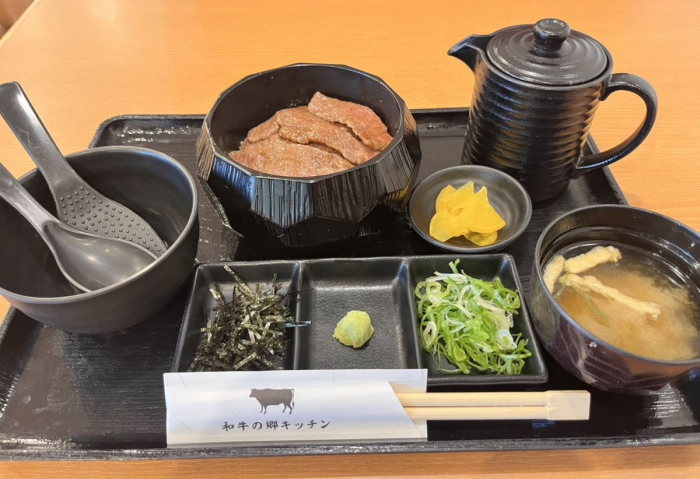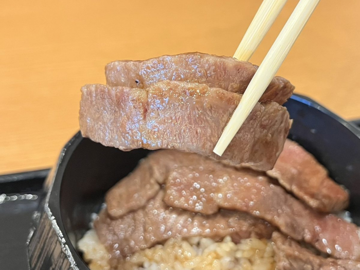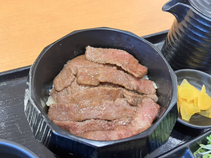 テーブルに運ばれてきた丼は、ご飯がまったく見えないほど、黒毛和牛がぎっしりと敷き詰められています。その迫力あるビジュアルは、思わず写真に収めたくなるほどのインパクト。