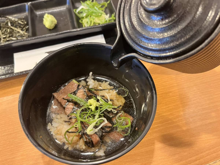 最後はだし汁を注いで、お茶漬け風にさらさらっと。優しい香りのだしと、黒毛和牛の旨みが一体となり、口当たりは軽やかで食べやすく、それでいて味わいはしっかりと濃厚。最後の一口まで飽きることなく楽しめるのが嬉しいポイントです。