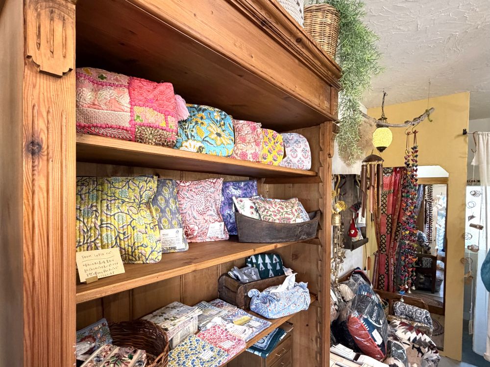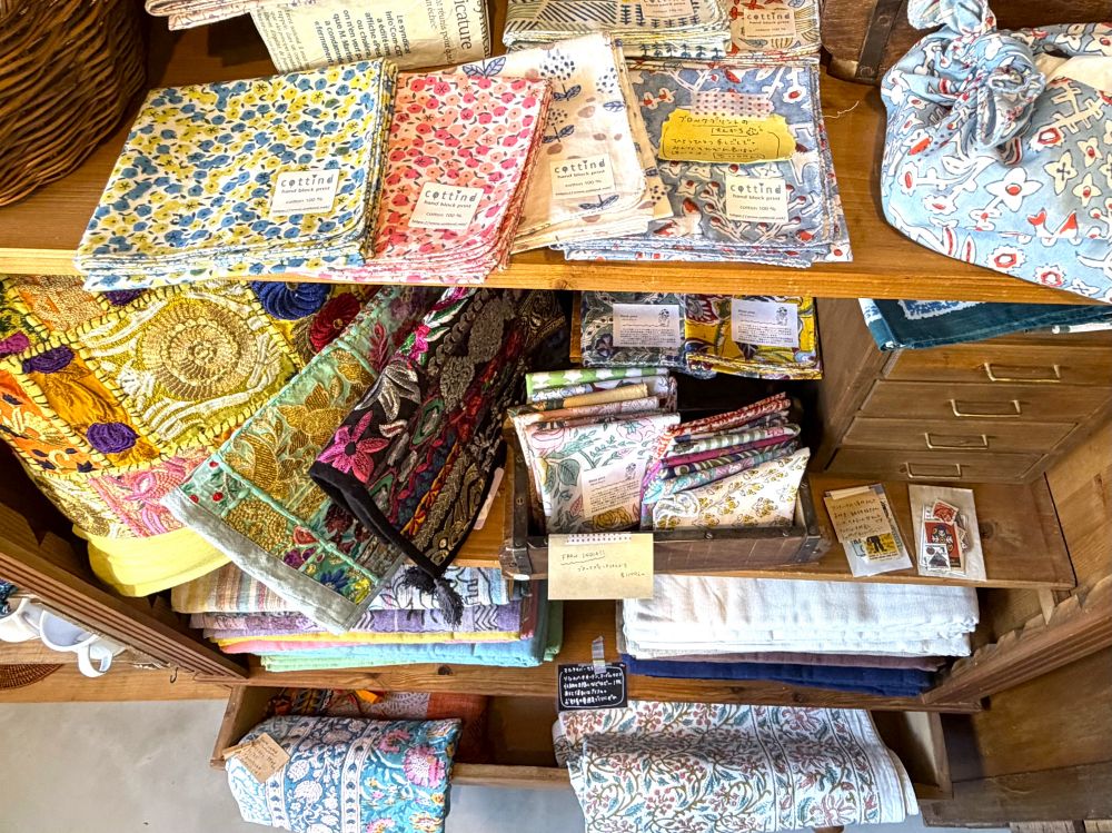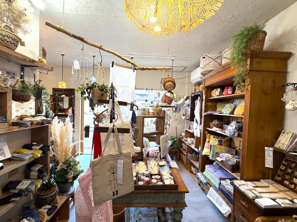 店内には、アジアン雑貨をはじめ洋服や靴下、ブロックプリント(手彫りの木版に染料をつけ、布に模様をスタンプのように繰り返し押して染める技法)というインドの伝統工芸の布物やカゴ、キッチン雑貨や紙ものに至るまで、さまざまな商品が並んでいます。