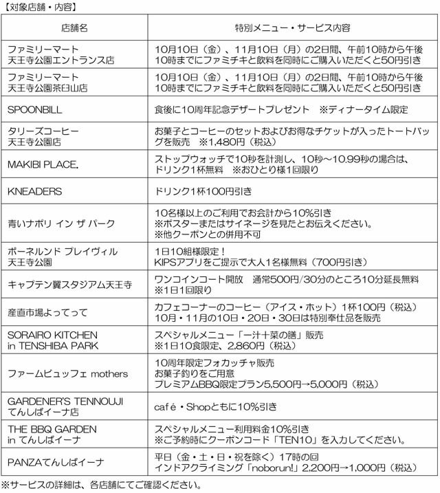 「てんしば」「てんしば i:na 」「茶臼山エントランスエリア」の対象店舗では2025年11月30日(日)まで、10年間の感謝を込めて特別メニューや限定サービスがスタンバイしています。
