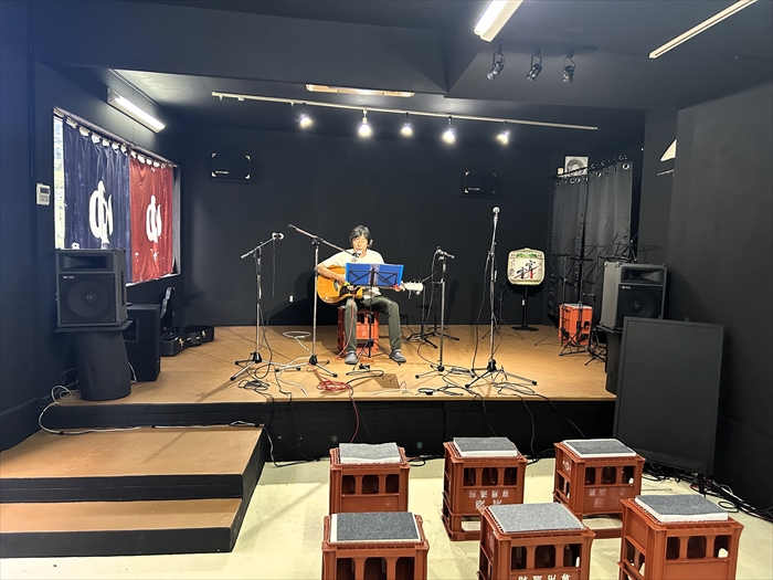 今回の改装では、レトロな雰囲気はそのままに、新しい文化拠点へと再生した。ステージと照明を整え、古いジュークボックスの外観を生かして音響設備を仕込み、清酒のプラスチックケースを座席に再利用するなど、温泉街らしい工夫を随所に盛り込んだ。
