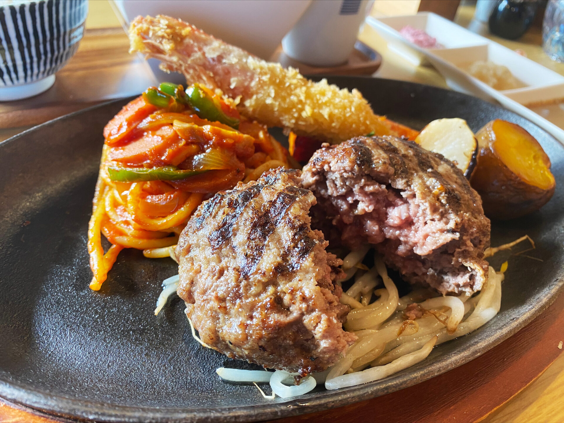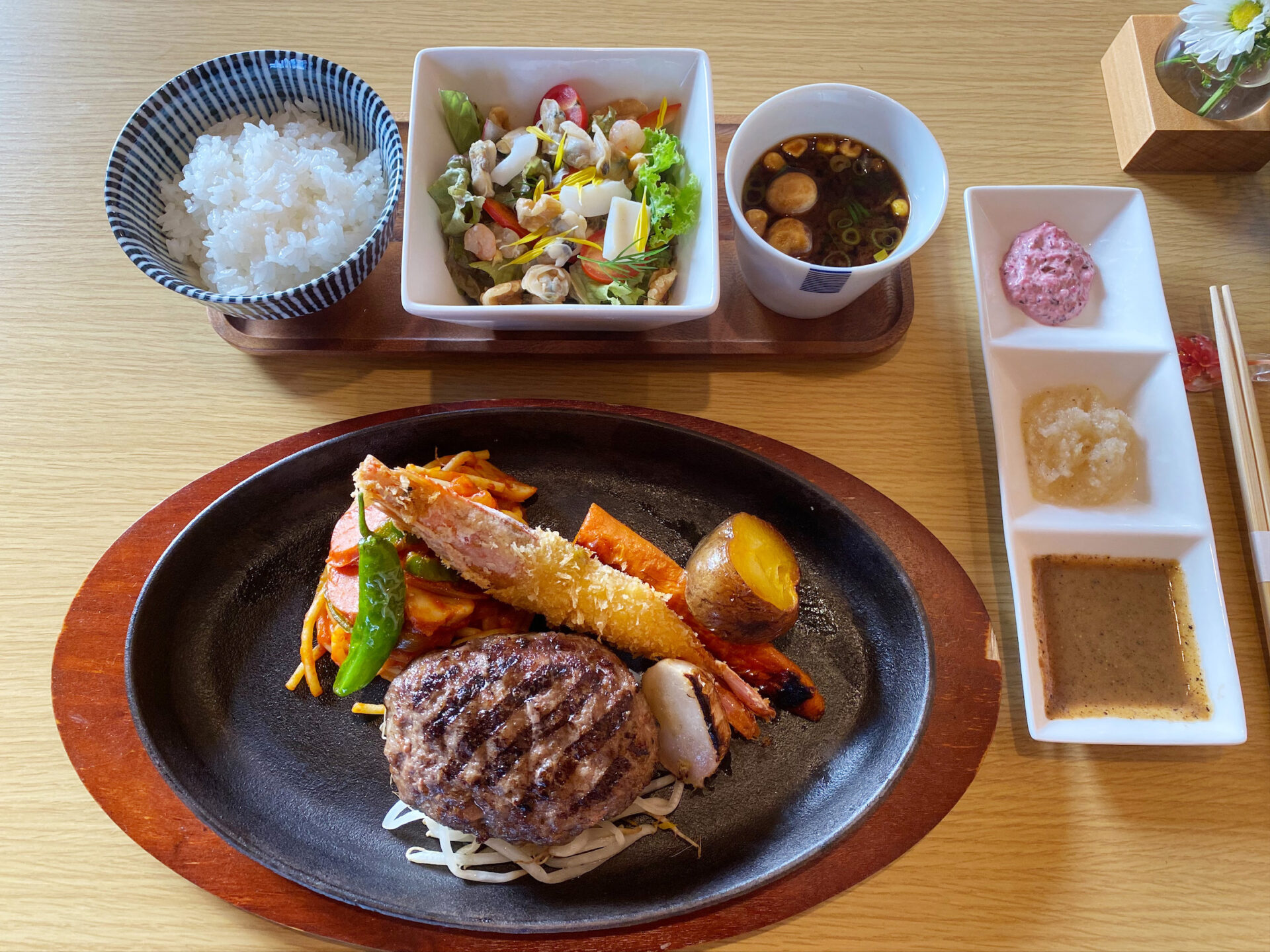 小田原駅から徒歩8分、閑静な住宅街に佇む「親方ハンバーグ」。和牛または和豚ハンバーグを選べる「大人様ランチ」が人気のお店です。魚介たっぷりのサラダ、頭付きエビフライ、懐かしのナポリタンと、こだわりが詰まった贅沢な一皿。3種のソースを添えて好みの味で楽しめるのも魅力です。
