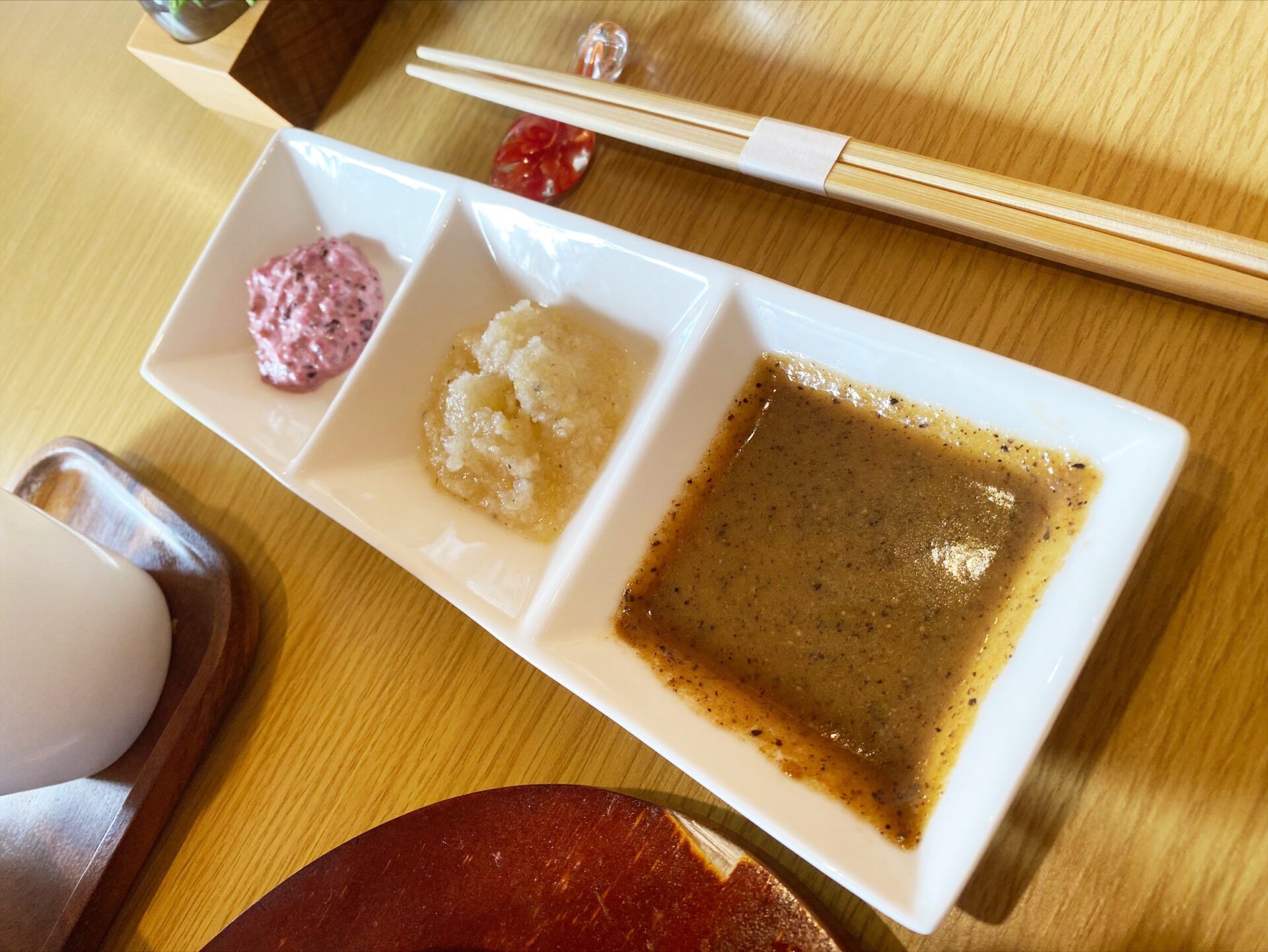 小田原市本町、国道1号沿いにある「鯵壱北條。」は、古民家風の外観と、靴を脱いでくつろげる和空間が魅力のラーメン店です。看板メニューは「鯵醤油ラーメン」。山椒・湘南ゴールド・梅の3種の調味料が添えられ、味変も楽しめます。魚介と豚骨・鶏のスープに中太麺、華やかなトッピングが彩りを添えます。
