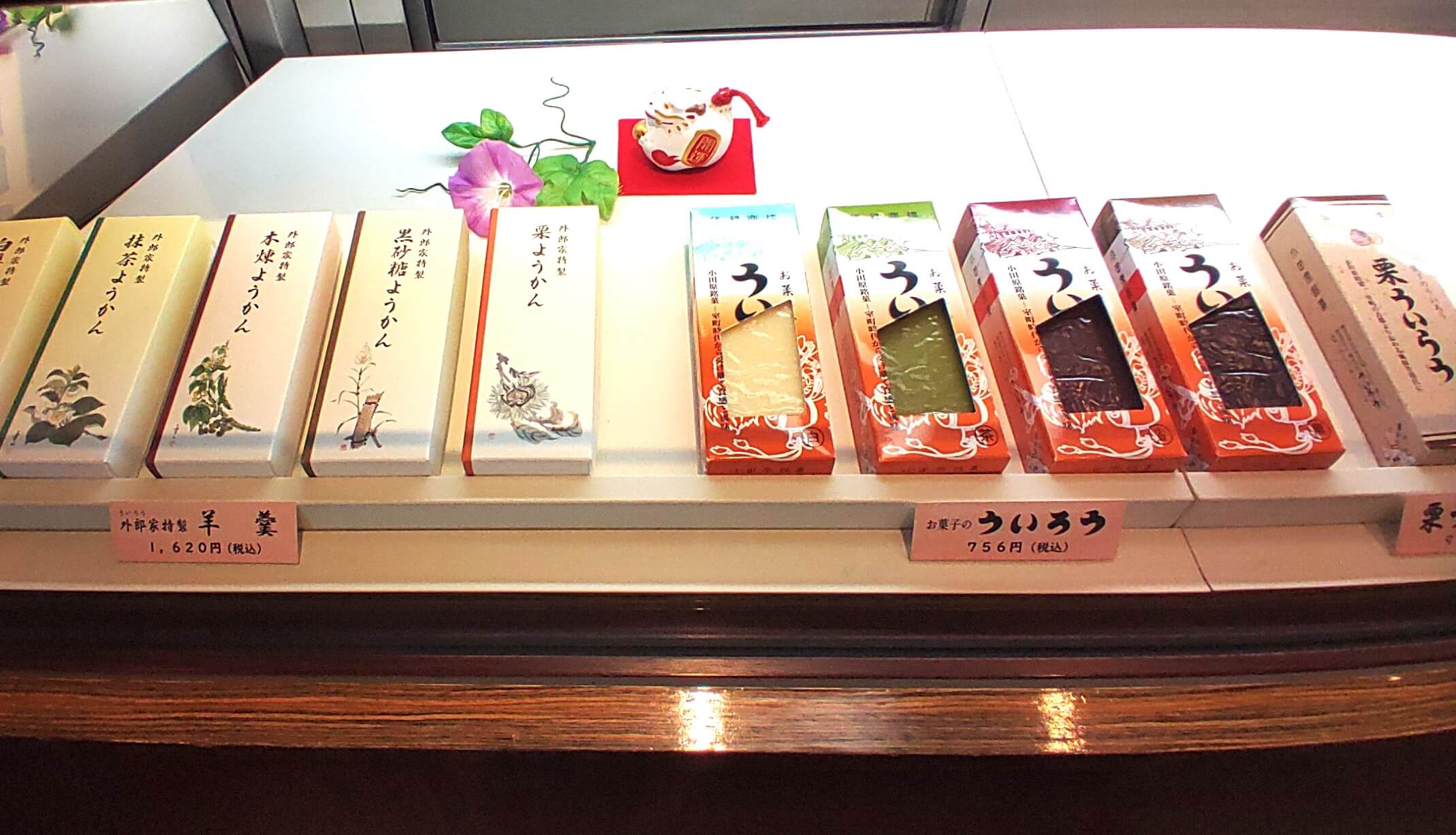店内へ入り和菓子売り場を抜けると、白を基調とした落ち着いた喫茶スペースが広がります。ういろうは、小田原で愛される老舗の有名店。店員さんの温かく丁寧なおもてなしも印象的でした。