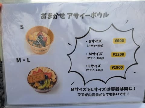 アサイーボウルはSサイズの600円~Lサイズの1800円まであります。 Sサイズがあるというのが個人的に嬉しいポイント! 少し食べたい時やアサイーボウルを食べたことない人が挑戦しやすいです。