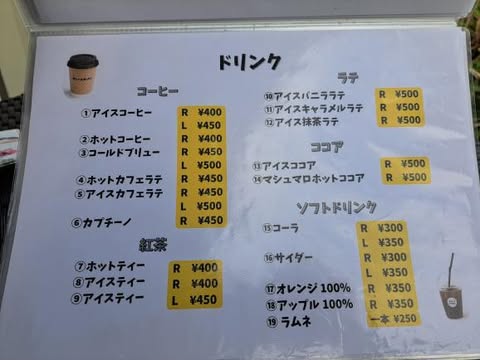 コーヒー、紅茶、ラテ、ココア、ソフトドリンクが全部で19種類。
