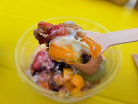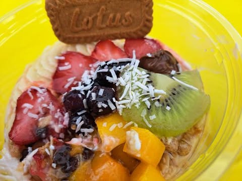 トッピングはおススメで作ってもらいました。 イチゴ、キウイ、マンゴー、ブルーベリー、バナナ、グラノーラやビスケットと種類多い&カラフル!