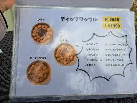 文字通り「ワッフル」をソースに「ディップ(浸す)」して食べるスイーツです。 これまたソースが10種類と多いんですよ!