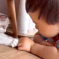 目の前に突然大きな足が現れたことで、イトちゃんは驚いてしまうか…と思いきや。こはくちゃんの前足を見たイトちゃんは、驚くどころか自分の小さな手をこはくちゃんの前足の上に乗せてみたのだとか!