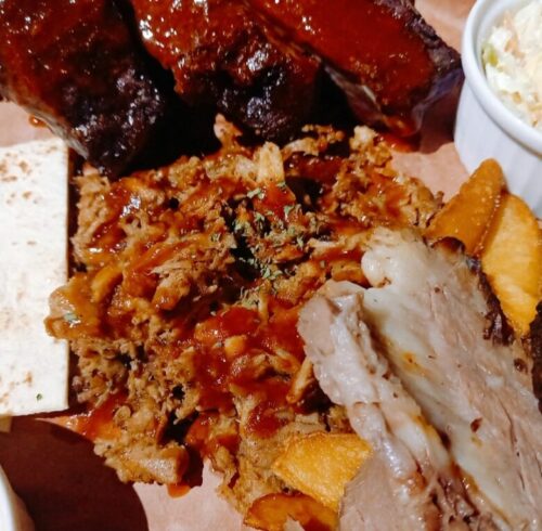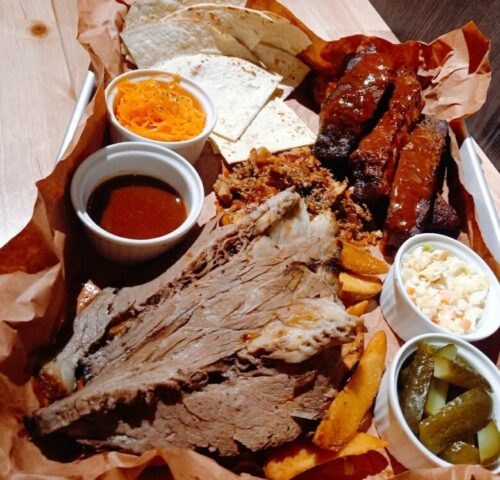 お店の看板メニューのプレートは3~4人前のボリューム。 奥からスペアリブ・トルティーヤ・プルドポーク・ポテト・あか牛のブリスケット。 自家製のキャロットラペとコールスローサラダ、ピクルスとソースがついてきます。 写真より実物の方がインパクトすごい…!
