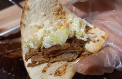 コールスロー&トルティーヤで食べるのがポピュラーですが、ライターはポテトと食べるのが合いました。