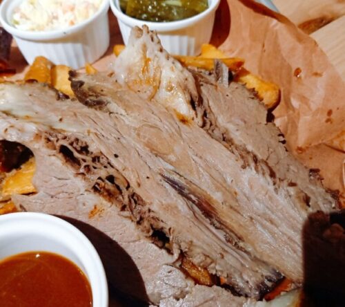 食べ方は「自由」。 そのまま齧り付く・野菜と一緒にトルティーヤに巻いて食べる・ソースにつける…食べたいように食べるのがお店流です。 ブリスケット(肩ばら肉)の脂身は、長時間火にかけたことで油っぽさが抜けて、ほぼコラーゲン。