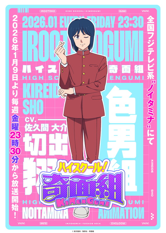 令和の時代にハイテンションなギャグアニメの放送が決定。全国フジテレビ系“ノイタミナ”にて、TVアニメ『ハイスクール!奇面組』が、2026年1月より放送される。このたび、各“組”のリーダービジュアル第四弾として、“色男組”のリーダー・切出翔が解禁。同役をSnow Manの佐久間大介が演じることが明らかになった。また、一堂零役の関智一との2ショットや、アフレコ風景写真、コメントが到着した。