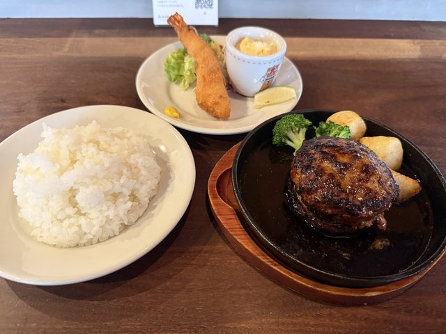 今回は鉄板ハンバーグに、大海老フライトッピングにしました。