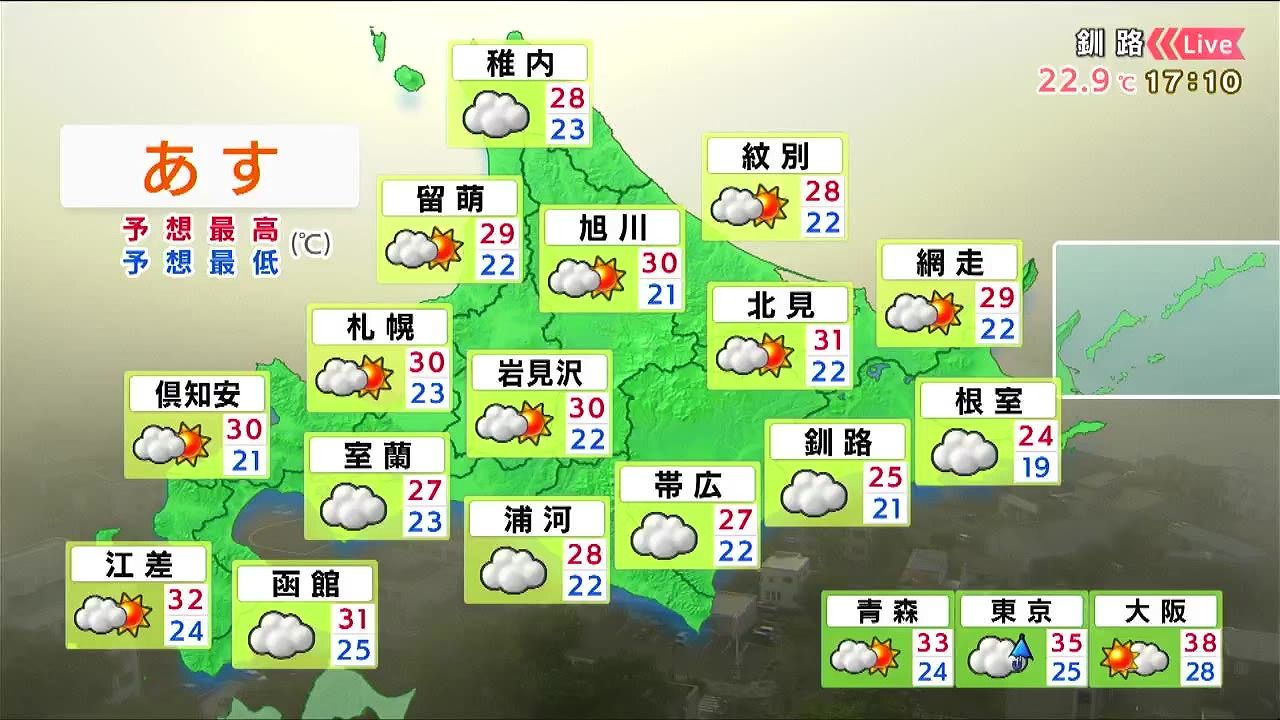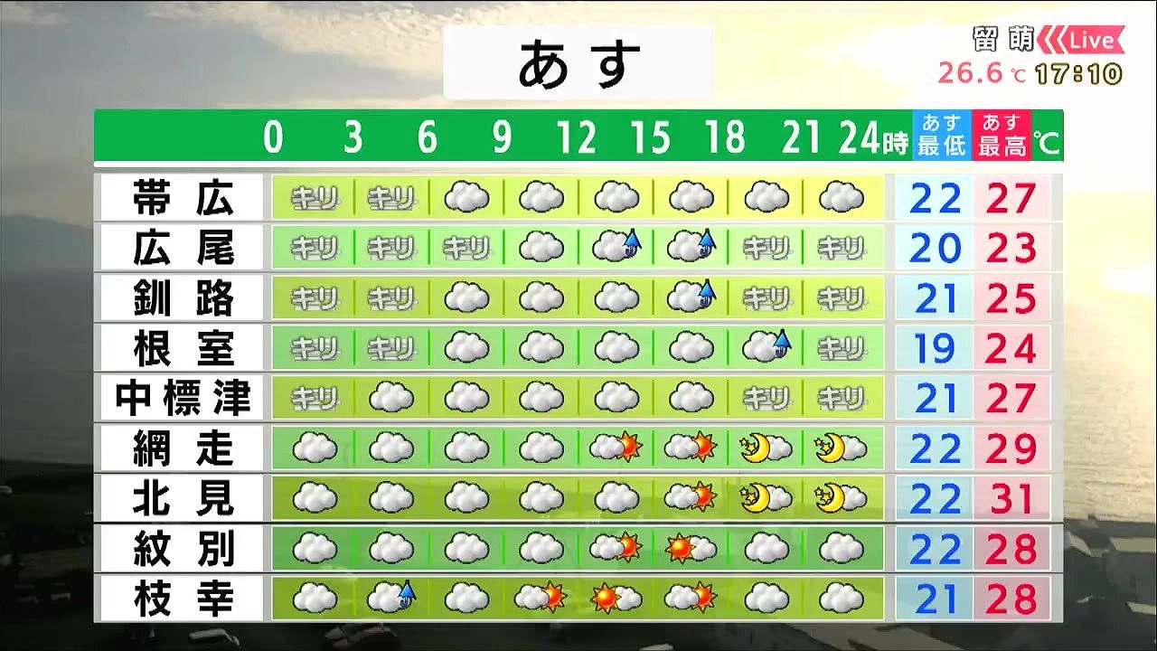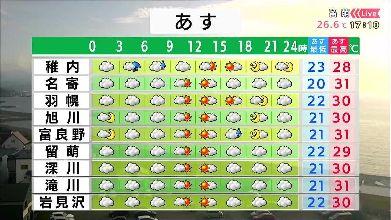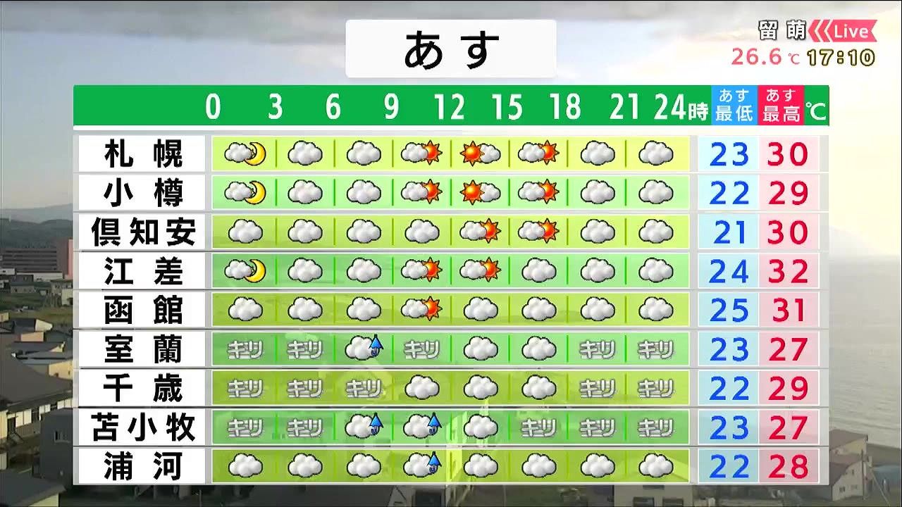 札幌や小樽、江差などは日が差して、30度前後まで気温が上がります。湿度が高く不快な暑さになりそうです。胆振や日高地方は午前を中心に霧雨や小雨が降り、ムシムシするでしょう。