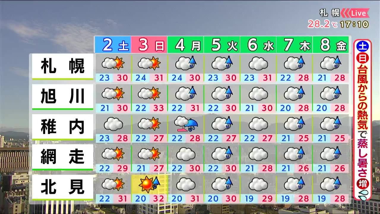 日曜も日が差しますが、北見など内陸や山沿いで、日曜もにわか雨に注意して下さい。土日も蒸し暑く、来週は曇りや雨でジメジメするでしょう。