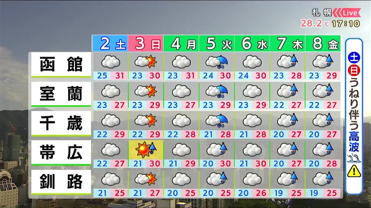 日曜は晴れ間があり、広く30度前後と暑くなりますが、帯広周辺で天気が急変するでしょう。土日はうねりを伴い波が高くなるので、釣りなどは危険な場所に近づかないで下さい。