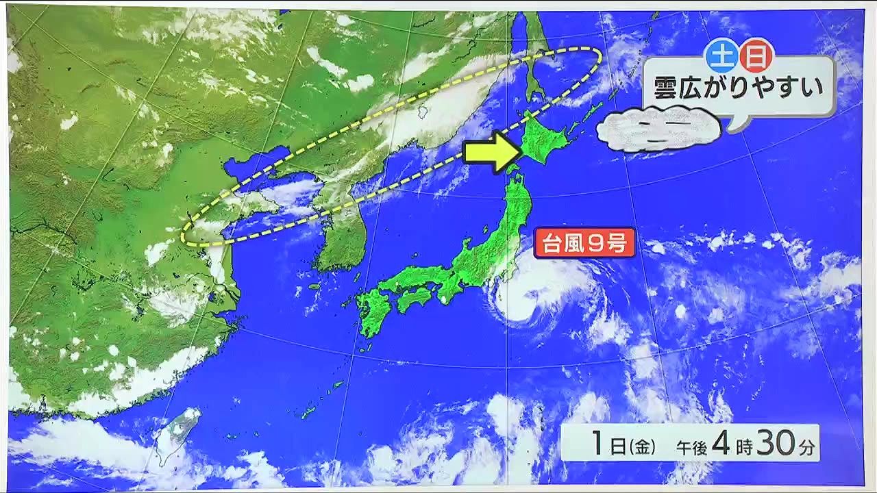 北海道付近に目立った雲はなく、広く晴れています。南にある渦をまく雲は台風9号です。これからあす2日(土)朝にかけて関東の東海上へ進み、関東に最も接近します。その後は進路を東へ変え、離れていくでしょう。