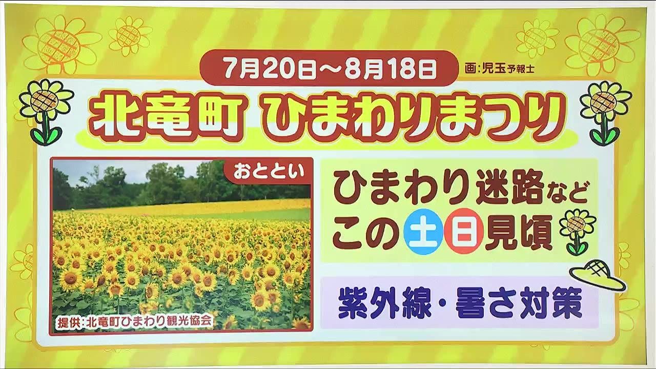 ひまわりまつりが開催中です。観光協会の方によると、場所によって植えるタイミングを変えて、長く楽しめるようにしているそうです。この土日は、有名な「ひまわり迷路」のエリアや、メインのエリアなどが見ごろとのことでした。紫外線と暑さ対策をして、お出かけください。