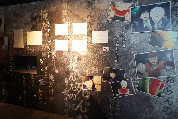 TVアニメでは効果的に音が使われているが、本展でも蝉の音やTVアニメに登場した曲が流れており、作中の夏の空気や湿度が伝わってくる気がした。またTVアニメは色彩が際立っており、青春をイメージさせる青、生命力あふれる緑、危険や恐怖を連想させる赤、光の白と闇の黒などが感情を揺さぶる。本展もその叙情的な魅力が生かされており、空間を満たす色が印象的だ。