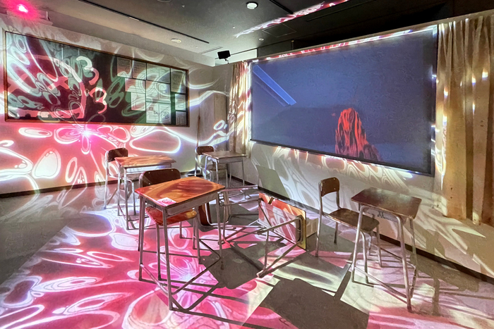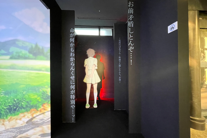 会場に流れる映像はアニメへの没入を誘う。中でも「教室」で鑑賞できる体感型の映像は恐ろしいが美しく、まるで自分が佳紀になって〝ナニカ〟に浸食されているような感覚を味わえる。