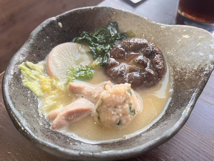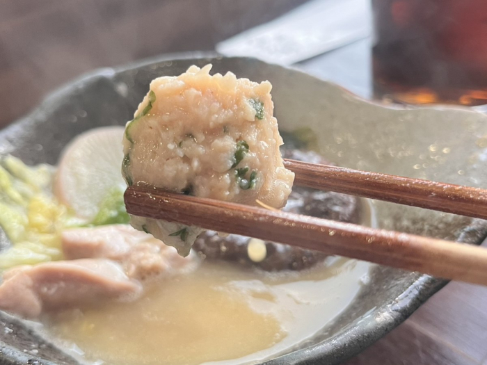 大葉をたっぷり練り込んだつくねは、丸める前から香りがふんわり漂います。自分で形を整え、鍋に入れる瞬間のワクワク感もまた、この店ならではの楽しみです。