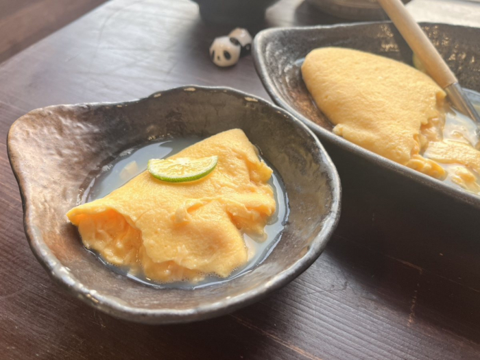 今回選んだ一品は「こだわり卵のオムレツ 明石焼き風」。澄んだ出汁に浸かってテーブルに運ばれてくる様子は、一目で心を奪われるほどのインパクト!