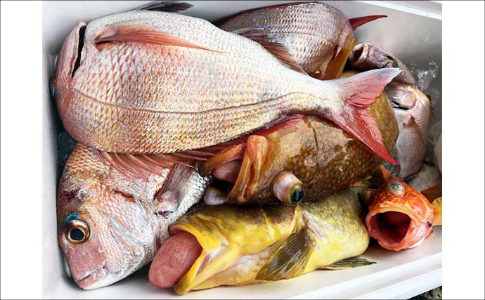 10月18日、佐賀県唐津市鎮西町串浦港の勇勝丸が壱岐周辺のタイ釣りに出船。マダイ、レンコダイ、アラカブ、アコウ(キジハタ)、アオナ(アオハタ)などでクーラーの中を埋めており、「マダイは彼岸鯛サイズでしたが1人4、5尾は釣っていました」とのこと。釣り大会を開催中。