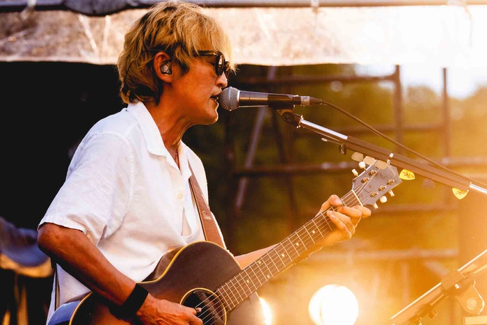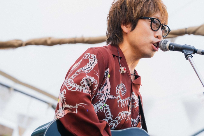 川崎のステージでは雨脚が強くなり、観客の気持ちに少しの不安が見える瞬間も。それでも「この雨のなか、遊びにきてくれた音楽好きが最後まで楽しめるように。リラックスできたな、と思ってもらえるライブがしたい」と意気込みを語る。イベント当日、実は子どもの保育園の運動会と日程が重なってしまったという彼。子どもはかけっこで転んでしまったものの、泣かずに最後までゴールできたと報告を受け、「父ちゃんも雨の中、汗をかきながら、一人一人のために心を込めて歌いたい!」と、「魔法の絨毯」へ。緩やかな空気の中で聴く等身大のラブソング。心情が何度も反芻され、心の奥にしっかり刻み込まれていくのを感じる。