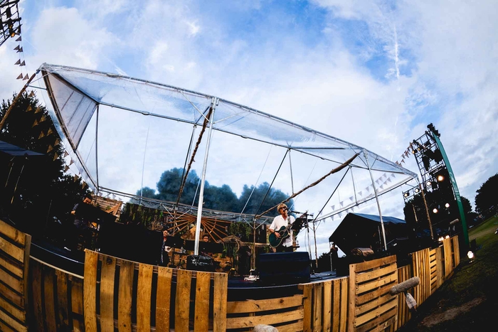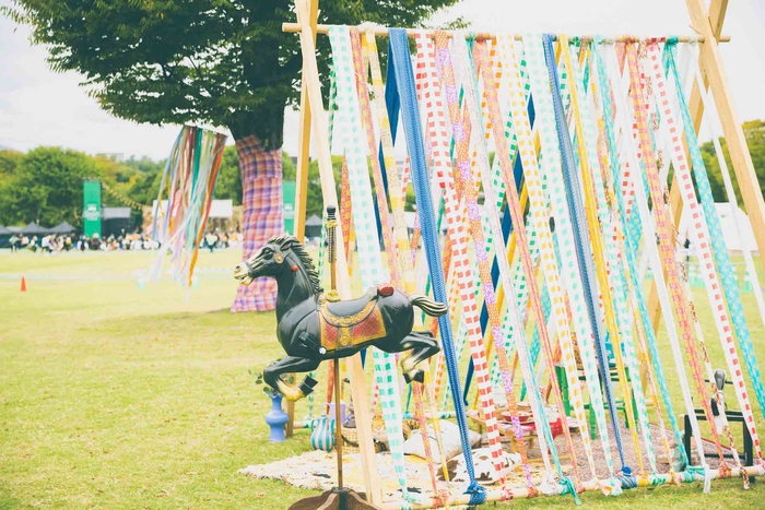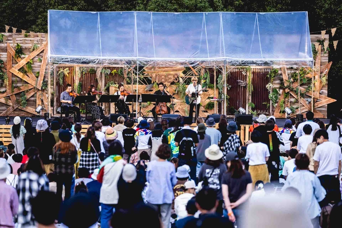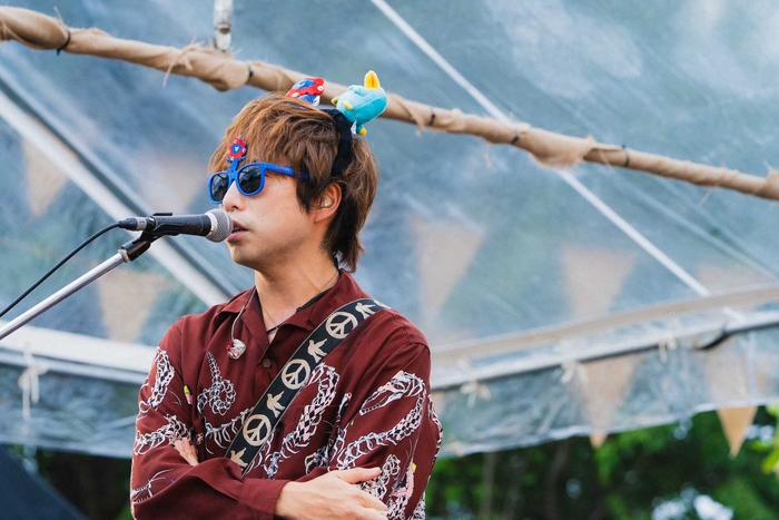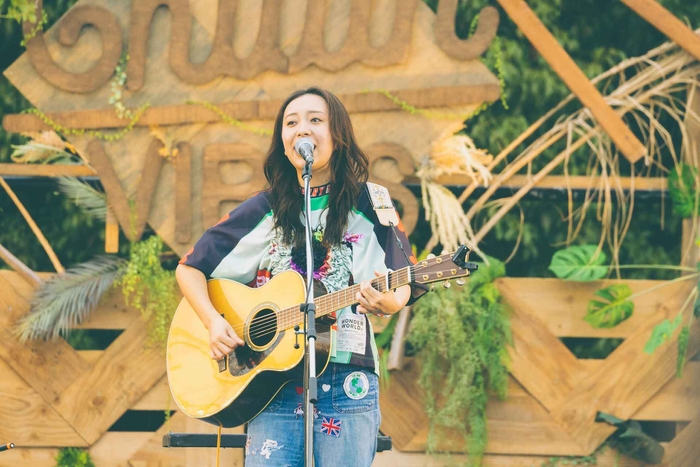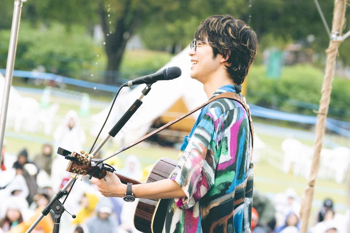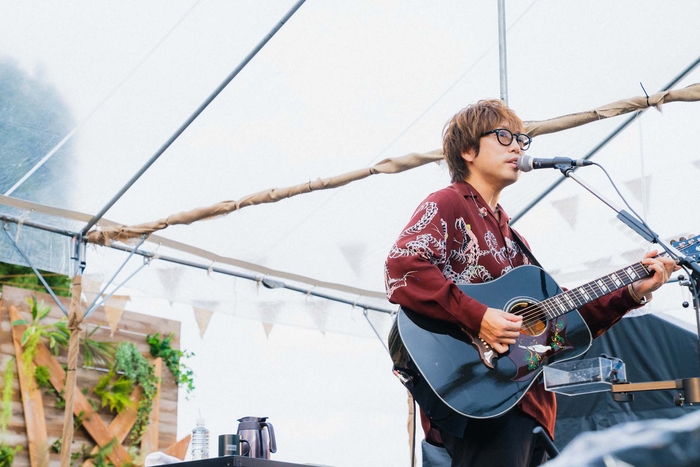 ギター1本と歌声だけ、原点ともいえるスタイルで会場を盛り上げたのが川崎鷹也だ。1曲目「カレンダー」ハスキーで深みのある歌声で観客の視線を奪うと、「ミュージック&リラックス。座りながらゆったり観られる珍しいフェス。このイベントならではの空気を楽しみつつ、自分らしく楽しんで」と、次曲「君の為のキミノウタ」へ。体温に近いような、柔らかく温かな歌声が心地よく体に浸透していく。誰かに語りかけるように、心情を込めて歌う姿にも目が離せない。