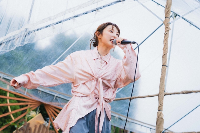 「めちゃくちゃ素敵な景色‼ 野外の会場は一人ひとりの顔がばっちり見えるし、公園だと空気もおいしい! ピクニックでみんながリラックスして聴いてる姿を見ると、生活と音楽が隣り合わせになっているのがよく分かる。音楽って良いなって改めて思える」と喜びを語る。「絶対にこのイベントで歌いたいと思っていた曲を。曇っていても、雨でも、自分の心の中は自分で晴らすことができるから。あなたの心の雨雲を歌で吹き飛ばしていけたらいいな」と、「空と青」へ。優しくて美しいメロディに乗せ、はしゃぎながら歌う彼女の姿は愛おしくて、観客の手拍子も一層大きく弾む。