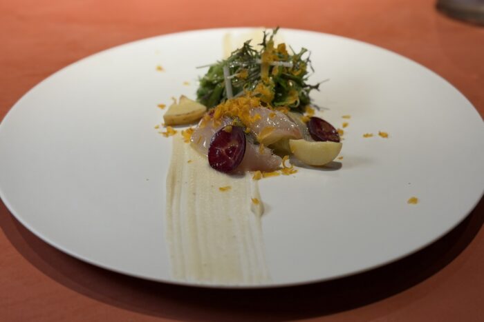 肉厚で脂の乗った静岡産金目鯛は、皮はパリッと、中はしっとりとしていて絶品です。北寄貝、菊菜、銀杏が添えられていて、彩も豊かです。白ワインと玉ねぎのソースはコクがあり、後味はすっきりとしています。