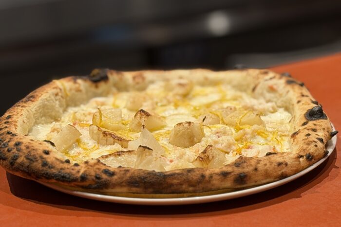 1つめは楚蟹 蕪 柚子 モッツァレッラのピッツァ。切り分けて1切れずついただきます。