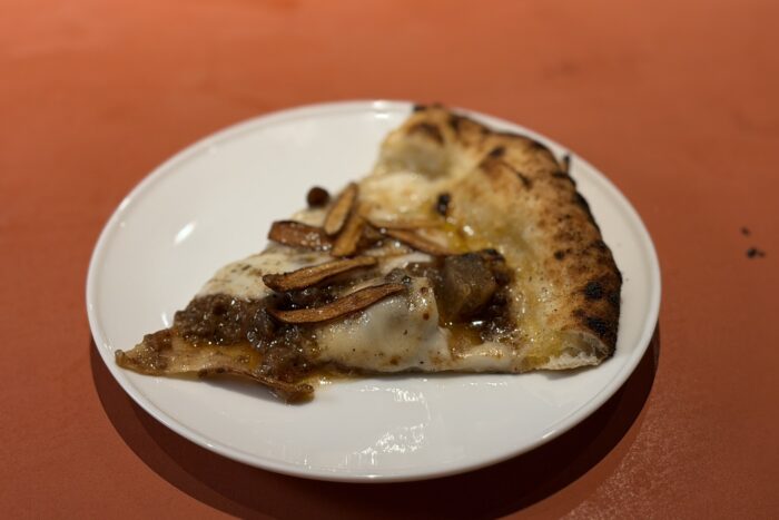 ズワイガニの実がたっぷりと使われた贅沢なピッツァ。1切だけでも味のインパクトが非常に強いです。