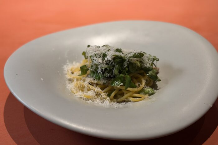 パスタはタリオリーニで、鶉(うずら)を白ワインで軽く煮込んだソースを使用。たっぷりのクレソン、畑のキャビアとも呼ばれる山形県産とんぶり、チーズと共に味わえます。